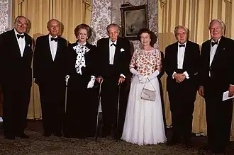 Without a bomb shelter, during World War II the Prime Minister abandoned Number 10 instead using a flat in the Foreign office that became known as the No.10 Annexe, and lay above the much more comprehensive underground bunker used by Winston Churchill and now known as the Churchill War Rooms.[62] To reassure the people that his government was functioning normally, he insisted on being seen entering and leaving Number 10 occasionally, and indeed, continued to use it for meetings and dinners despite being urged not to.[63] Harold Wilson, during his second ministry from 1974 to 1976, lived in his home in Lord North Street because Mary Wilson wanted "a proper home".[64]