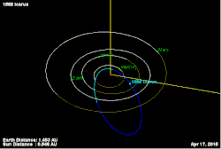 The last close approach was on 16 June 2015, when Icarus passed Earth at 0.05383 AU (8,053,000 km; 20.95 LD).[6][23] Before that, the previous close approach was on 11 June 1996, at 0.10119 AU (15,138,000 km), almost 40 times as far as the Moon. The next notably close approach will be on 13 June 2043, at 0.0586 AU (8,770,000 km) from Earth.[23]