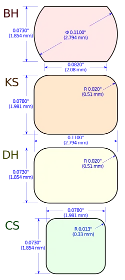 Film perforations were originally round holes cut into the side of the film, but as these perforations were subject to wear and deformation, the shape was changed to what is now called the Bell & Howell (BH) perforation, which has straight top and bottom edges and outward curving sides. The BH perforation's dimensions are 0.110 inches (2.8 mm) from the middle of the side curve to opposite top corner by 0.073 inches (1.9 mm) in height.[59] The BH1866 perforation, or BH perforation with a pitch of 0.1866 inches (4.74 mm), is the modern standard for negative and internegative films.[60]