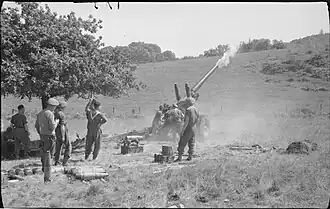 By the time of the Normandy landings, medium regiments were equipped with the 5.5-inch gun (two 8-gun batteries), heavy regiments with 155 mm guns and 7.2-inch howitzers (two 4-gun batteries of each).[3] In the field they were often supplemented by 3.7-inch heavy anti-aircraft (HAA) guns from the AA brigades who had few air targets.[3][11] Although AGRAs were 'Army Troops', 8 AGRA primarily supported VIII Corps