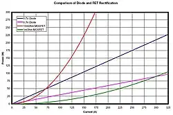Voltage drop across a diode and a MOSFET. The low on-resistance property of a MOSFET reduces ohmic losses compared to the diode rectifier (below 32 A in this case), which exhibits a significant voltage drop even at very low current levels. Paralleling two MOSFETs (pink curve) reduces the losses further, whereas paralleling several diodes won't significantly reduce the forward-voltage drop.