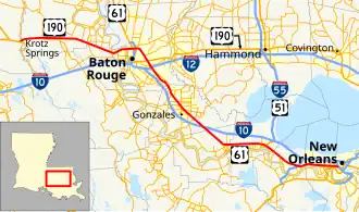 Airline Highway is a divided highway in the U.S. state of Louisiana, built in stages between 1925 and 1953 to bypass the older Jefferson Highway. It runs 115.6 miles (186.0 km),[1] carrying U.S. Highway 61 from New Orleans northwest to Baton Rouge and U.S. Highway 190 from Baton Rouge west over the Mississippi River on the Huey P. Long Bridge. US 190 continues west towards Opelousas on an extension built at roughly the same time.