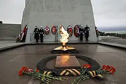 Slightly to one side of the monument are two anti–aircraft guns. (During the war, anti–aircraft guns were emplaced at the site as part of the air defense of Murmansk.)[1] Built into the foot of the monument are two capsules, one with seawater from the gravesite of the patrol craft Tuman which sank while fighting off three German destroyers,[A] one with earth from the Valley of Glory and from the Verman River front.