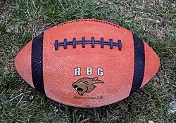 The football itself is a prolate spheroid leather ball, similar to the balls used in rugby or Australian rules football.[79] To contain the compressed air within it, a pig's bladder was commonly used before the advent of artificial rubber inside the leather outer shell to sustain crushing forces.[80][81] At all levels of play, the football is inflated to 12+12 to 13+12 psi (86 to 93 kPa), or just under one atmosphere, and weighs 14 to 15 ounces (400 to 430 g);[78][82][83] beyond that, the exact dimensions vary slightly. In professional play the ball has a long axis of 11 to 11+14 inches (28 to 29 cm), a long circumference of 28 to 28+12 inches (71 to 72 cm), and a short circumference of 21 to 21+14 inches (53 to 54 cm).[84] In college and high school play the ball has a long axis of 10+78 to 11+716 inches (27.6 to 29.1 cm), a long circumference of 27+34 to 28+12 inches (70 to 72 cm), and a short circumference of 20+34 to 21+14 inches (53 to 54 cm).[78][82]
