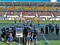 Football games last for a total of 60 minutes in professional and college play and are divided into two halves of 30 minutes and four quarters of 15 minutes.[85][86] High school football games are 48 minutes in length with two halves of 24 minutes and four quarters of 12 minutes.[87] The two halves are separated by a halftime period, and the first and third quarters are followed by a short break.[85][86][88] Before the game starts, the referee and each team's captain meet at midfield for a coin toss. The visiting team can call either "heads" or "tails"; the winner of the toss chooses whether to receive or kick off the ball or which goal they wish to defend. They can defer their choice until the second half. Unless the winning team decides to defer, the losing team chooses the option the winning team did not select—to receive, kick, or select a goal to defend to begin the second half. Most teams choose to receive or defer, because choosing to kick the ball to start the game allows the other team to choose which goal to defend.[89] Teams switch goals following the first and third quarters.[90] If a down is in progress when a quarter ends, play continues until the down is completed.[91][92][93] If certain fouls are committed during play while time has expired, the quarter may be extended through an untimed down.[94]