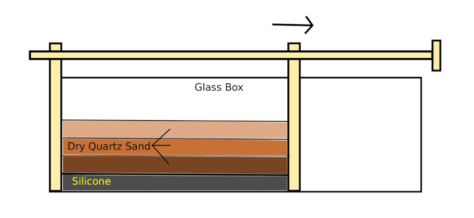 The simplified analogue modelling setting of shear deformation. This model is built on two separate horizontal plates. The brownish layers are dry sand, wet clay, and viscous materials, such as silicone or polydimethylsiloxane.[26]