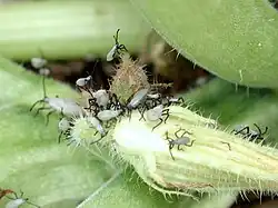 Anasa tristis is a true bug that feeds by sucking sap, mainly from the leaves, but sometimes also the fruit. Historically, at least as far back as 1902, some gardeners believed that A. tristis had toxic saliva, however more recent research from 1993 suggests the process of harming plants does not involve any toxins. What happens is that the insects physically damage the xylem and leaves of the plant, which causes them to wilt, darken in colour and die.[5] The heavier the infestation, the greater the damage to the plant. Sometimes one plant or part of a plant can be heavily attacked while surrounding plants are untouched.[3] Besides the direct damage their feeding causes to the plant, these insects can act as vectors for cucurbit yellow vine disease caused by the bacterium Serratia marcescens. This disease can kill the plants.[6]
