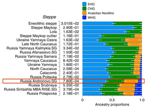 - ^ "We observed a main cluster of Sintashta individuals that was similar to Srubnaya, Potapovka, and Andronovo in being well modeled as a mixture of Yamnaya-related and Anatolian Neolithic (European agriculturalist-related) ancestry."[65]