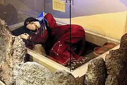 The Andronovo dead were buried in timber or stone chambers under both round and rectangular kurgans (tumuli). Burials were accompanied by livestock, wheeled vehicles, cheek-pieces for horses, and weapons, ceramics and ornaments. Among the most notable remains are the burials of chariots, dating from around 2000 BC and possibly earlier. The chariots are found with paired horse-teams, and the ritual burial of the horse in a "head and hooves" cult has also been found.[7] Some Andronovo dead were buried in pairs, of adults or adult and child.[50]