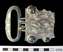 Burial finds from the fourth or early fifth century in Oxfordshire (prior to the Anglo-Saxon migration) have found evidence that military leaders of that time period wore belts that were elaborate, wide, and fastened by "a narrow strap which was riveted to the broad belt and passed through a buckle which was much narrower than the belt itself" leaving the end of the belt to hang down; attached to the belt were pouches which allowed soldiers to carry their weapons.[81]