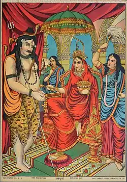 In some depictions, Shiva is shown standing to her right with a begging bowl, begging her for alms.[8]