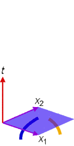 Exchange of two particles in 2+1 spacetime by rotation. The rotations are inequivalent, since one cannot be deformed into the other (without the worldlines leaving the plane, an impossibility in 2d space).