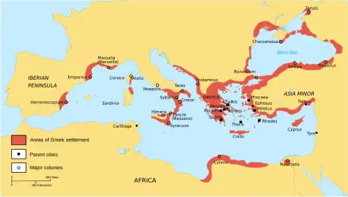 The earliest Greek colonies were on Sicily. Many of these were founded by people from Chalcis, but other Greek states, such as Corinth and Megara were also responsible for early colonies in the area.[45] By the end of the eighth century BC, Greek settlements in southern Italy were also well established.[46] In the seventh century, Greek colonists expanded the areas that they settled. In the west, colonies were founded as far afield as Marseille. In the east, the north Aegean, the Sea of Marmara, and the Black Sea all saw colonies founded.[47] The dominant coloniser in these parts was Miletus.[48] At the same time, early colonies such as Syracuse and Megara Hyblaea began to themselves establish colonies.[47]