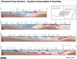 - ^ a b Byrnes, Alan P.; Lawyer, Gary (March 1999). "Burial, Maturation, and Petroleum Generation History of the Arkoma Basin and Ouachita Foldbelt, Oklahoma and Arkansas". Natural Resources Research. 8 (1): 3–26. Bibcode:1999NRR.....8....3B. doi:10.1023/A:1021625526579. S2CID 127333100. Retrieved 2021-11-02.