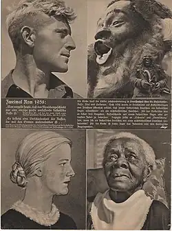 Nazi racial theorist Hans F. K. Günther identified the European race as having five subtype races: Nordic, Mediterranean, Dinaric, Alpine, and East Baltic.[4] Günther applied a Nordicist conception that Nordics were the highest in the racial hierarchy amongst these five European subtype races.[4] In his book Rassenkunde des deutschen Volkes (1922) (Racial Science of the German People), Günther recognized Germans as being composed of all five European subtypes, but emphasized the strong Nordic heritage amongst Germans.[5] Günther believed Slavic people to be of Eastern race, one that was separate from Germans and Nordics, and warned about mixing German blood with Slavic one.[6] He defined each racial subtype according to general physical appearance and their psychological qualities including their racial soul – referring to their emotional traits and religious beliefs, and provided detailed information on their hair, eye, and skin colours, facial structure.[5] He provided photographs of Germans identified as Nordic in places like Baden, Stuttgart, Salzburg, and Schwaben; and provided photographs of Germans he identified as Alpine and Mediterranean types, especially in Vorarlberg, Bavaria, and the Black Forest region of Baden.[5] Adolf Hitler read Rassenkunde des deutschen Volkes, which influenced his racial policy and resulted in Günther's Nazi-backed attainment of a position in the anthropology department at the University of Jena in 1932 where Hitler attended Günther's inaugural lecture.[7]