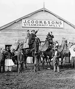 During the period from the 1860s to 1900, small groups of cameleers, mostly from British India but also from other countries including Afghanistan, Egypt, Iran, and Turkey, were shipped in and out of Australia on three-year contracts to service the inland pastoral industry.[16] These workers, who were commonly referred to as "Afghans" or "Ghans", were responsible for carting goods and transporting wool bales by camel train. Most of the cameleers were Muslims, with a sizeable minority being Sikhs from the Punjab region. They established camel-breeding stations and rest house outposts, known as caravanserai, throughout inland Australia, creating a permanent link between the coastal cities and remote cattle and sheep grazing stations. This practice continued until around the 1930s, when the cameleers were largely replaced by automobiles.[16]