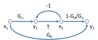 where is the return ratio with the input source disabled (equal to the negative of the loop gain in the case of a single-loop system composed of unilateral blocks), G∞ is the asymptotic gain and G0 is the direct transmission term. This form for the gain can provide intuitive insight into the circuit and often is easier to derive than a direct attack on the gain.