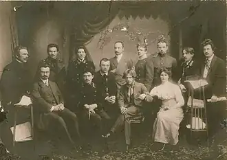 In January 1910, Lietuvos žinios began publishing Aušrinė, a supplement geared towards youth.[2] Informal student groups began organizing in various schools across Lithuania (then part of the Russian Empire) that followed the ideology of Aušrinė. Soon other student groups formed around the Catholic Ateitis. The two groups split the student population and often competed with each other.[3] All of these groups were illegal as no student organizations were allowed by the Tsarist regime.[4] Aušrininkai organized social gatherings and meetings to discuss ideas, shared books and periodicals, prepared research papers on Lithuanian or current topics (e.g. What is a Constitution? or Life and Teachings of Charles Darwin), collected folklore, even published their own newsletters.[4] Such groups were active in Marijampolė, Vilkaviškis, Ukmergė, Šiauliai (including member Julius Janonis), Telšiai (led by Butkų Juzė), Vilnius, Panevėžys (from 1913, led by Balys Sruoga).[5] The groups did not have any central leadership and acted mostly on their own based on principles outlined in Aušrinė.[6]