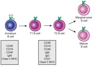 12. ^ a b c Chung JB, Silverman M, Monroe JG (June 2003). "Transitional B cells: step by step towards immune competence". Trends in Immunology. 24 (6): 343–349. doi:10.1016/S1471-4906(03)00119-4. PMID 12810111.