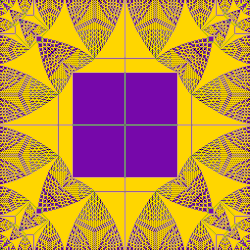 A popular special case of this model is given when the initial configuration is zero for all vertices except the origin. If the origin carries a huge number of grains of sand, the configuration after relaxation forms fractal patterns (see figure). When letting the initial number of grains at the origin go to infinity, the rescaled stabilized configurations were shown to converge to a unique limit.[11][12]