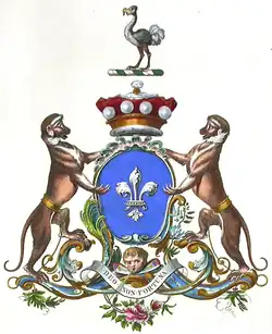 Arms of Digby: Azure, a fleur-de-lis argent. Crest: An ostrich, holding in the beak a horse-shoe all proper. Supporters: On either side a monkey proper environed about the middle and lined or.