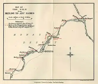 ![]() A map from Winston Churchill's The River War depicting the march of General-Major Hunter's flying column from Merawi to Abu Hamed. | |||||||