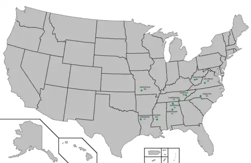 According to Stephen W. Tweedie, an Associate Professor Emeritus in the Department of Geography at Oklahoma State University, the Bible Belt was viewed in terms of numerical concentration of the audience for religious television when he first published his research in 1995.[8] He finds two belts: one more eastern that stretches from North Florida through Georgia, Alabama, Tennessee, Kentucky, Southside Virginia, and the Carolinas; and another concentrated in Texas (excluding El Paso and South Texas), Arkansas, Louisiana, (excluding New Orleans and Acadiana), Oklahoma, Missouri (excluding Kansas City and St. Louis), and Mississippi.[9] "[H]is research also broke the Bible Belt into two core regions, a western region and an eastern region." Tweedie's western Bible Belt was focused on a core that extended from Little Rock, Arkansas, to Tulsa, Oklahoma. His eastern Bible Belt was focused on a core that included the major population centers of Alabama, Georgia, and Tennessee.[10]
