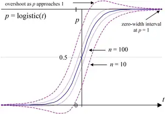 Plotting the normal approximation interval on an arbitrary logistic curve reveals problems of overshoot and zero-width intervals.[2]