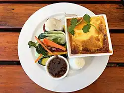 Bobotie (Afrikaans: Afrikaans pronunciation: [bəˈbuəti] ⓘ) is a South African dish consisting of spiced minced meat baked with an egg-based topping.[1]