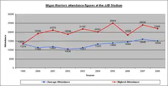 The stadium's average attendance has increased significantly since its opening in 1999. The Wigan Warriors' average attendance has increased by 32.5% from its first full season at the stadium in 2000, and Wigan Athletic's average attendance has increased by 181.2% from the 2000–01 season. The highest recorded attendance for a rugby league match is shared between three fixtures; the Wigan Warriors' fixture against St Helens R.F.C. on 25 March 2005; Game 4 of the 2005 Tri-Nations series between Great Britain and Australia on 6 November; and Game 5 of the 2004 Tri-Nations series between Great Britain and Australia on 13 November at 25,004 each.[24][25][26] The highest recorded football attendance at the stadium was Wigan Athletic's home fixture against Manchester United on 11 May 2008—the final day of the 2007–08 Premier League season—with 25,133 fans attending.[27] This is the stadium's highest recorded overall attendance to date, and was the match where Manchester United were crowned Premier League champions for that season.[28]