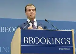 Former Russian President Dmitry Medvedev speaking at the Brookings Institution in April 2010