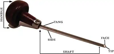A burin diagram, showing the handle, shaft, cutting tip, and face.[1] The bend in the shaft is especially associated with wood engraving.[2]