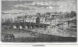 Carmarthen (UK: /kərˈmɑːrðən/, local: /kɑːr-/; Welsh: Caerfyrddin [kairˈvərðɪn], 'Merlin's fort' or possibly 'Sea-town fort') is the county town of Carmarthenshire and a community in Wales, lying on the River Towy 8 miles (13 km) north of its estuary in Carmarthen Bay.[3][4] At the 2021 census the community had a population of 14,636, and the built up area had a population of 16,455. It stands on the site of a Roman town, and has a claim to be the oldest town in Wales. In the middle ages it comprised twin settlements: Old Carmarthen around Carmarthen Priory and New Carmarthen around Carmarthen Castle. The two were merged into one borough in 1546.[5] It was the most populous borough in Wales in the 16th–18th centuries, described by William Camden as "chief citie of the country". It was overtaken in size by the mid-19th century, following the growth of settlements in the South Wales Coalfield.[5]