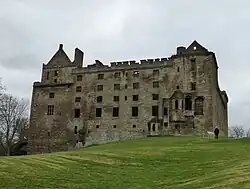 Much of this castle rebuilding was planned and financed by James Hamilton of Finnart (c. 1495–1540), in addition to his work at Blackness Castle, Rothesay Castle, the house at Crawfordjohn, the "New Inn" in the St Andrews Cathedral Priory and the lodging at Balmerino Abbey for the ailing Queen Madeleine.[39] Rather than slavishly copying continental forms, most Scottish architecture incorporated elements of these styles into traditional local patterns,[37] adapting them to Scottish idioms and materials (particularly stone and harl).[40] Similar themes can be seen in the private houses of aristocrats, as in Mar's Wark, Stirling (c. 1570) and Crichton Castle, built for the Earl of Bothwell in 1580s.[41]
