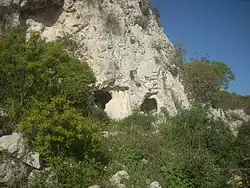 Cava del Rivettazzo consists of around a hundred rock-cut tombs dating to the Bronze Age, carved into a cliff face. When it was discovered at the beginning of the 20th century by Paolo Orsi, it was the only site with evidence of habitation in all three sub-periods of the Sicilian Bronze Age and it was thus a key site in the reconstruction of Sicilian prehistory.[1] In fact, based on the different shapes of the burial chambers and the discovery of flint knives, white limestone beads, and Pantalican ware inside them Orsi concluded that the necropolis represented a stage of transition from the first to the second period, which he called "Siculi". However, the grave goods in tomb 10 belonged to the third period. Thus he was able to conclude that Rivettazzo was inhabited by a small group of people, was visited for several centuries before the second millennium BC, and that a permanent community was established somewhere in the vicinity in the following period. According to Orsi, the settlement consisted of two groups, not far from one another, one beyond the peak of the Cozzo Bernardo hill, which looms over the necropolis and the other on the opposite bank near the Cozzo Carrubbedda.