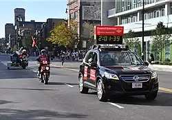 Evans Cheruiyot follows the course car (with clock) during his 2008 victory. The lead course car carries the current race time.