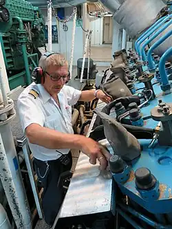 A chief engineer, commonly referred to as "Chief" or "ChEng", is the most senior licensed mariner (engine officer) of an engine department on a ship, typically a merchant ship, and holds overall leadership and the responsibility of that department.[1] In rank, a chief engineer is equivalent to the rank of a ship's captain. As a person who holds one of the most senior roles on the ship, they must have excellent communication and leadership skills. They will be expected to regularly work alongside other crew members and external consultants, and most importantly, provide guidance to their team.