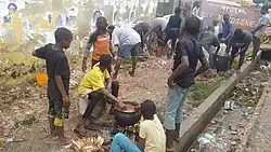 Children working at a young age has been a consistent theme throughout Africa. Many children began first working in the home to help their parents run the family farm.[83] Children in Africa today are often forced into exploitative labour due to family debt and other financial factors, leading to ongoing poverty.[83] Other types of domestic child labour include working in commercial plantations, begging, and other sales such as boot shining.[84] In total, there is an estimated five million children who are currently working in the field of agriculture which steadily increases during the time of harvest. Along with 30% of children who are picking coffee, there are an estimated 25,000 school age children who work year round.[85]