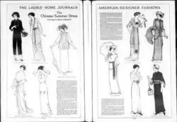 Chinese jackets with wrap closure also influenced American fashion in the early 1900s; an example of such jacket is the San toy (#4777), which appeared in American women's magazine, The Delineator, in 1901. In volume 57, The Delineator described it as being "Ladies' Chinese dressing" or as a "Lounging sack", and as having "a strong suggestion of the Orient".[44]: 216–217 The San toy was designed to be loose-fitting, a wrap closure on the left side (known as jiaoling zuoren in China) which closes with satin ribbon ties; it also featured deep side vents, which was considered as being a "novel effect", and was trimmed with a single band creating a fancy outline.[44]: 206, 217 The San toy of Volume 57 (#4777) reappeared in Volume 58 of The Delineator along with another Chinese-style inspired wrap top (#3920), one of which closed on the right side (known as jiaoling youren in China) with a single ribbon.[45]: 152 The Ladies' Chinese dressing sac #3920 appeared at least a year earlier and was published in Volume 56 of The Delineator of 1900.[46]