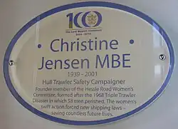 Jensen became the only former headscarf revolutionary to be awarded a British honour when she was appointed a Member of the Order of the British Empire in the 2000 New Year Honours for "services to trawler safety and to the community in Hull".[17][18][1] When a community theatre put on a play about the triple trawler tragedy that featured the death of her brother, Jensen acted as an adviser.[19] She died in 2001.[20]