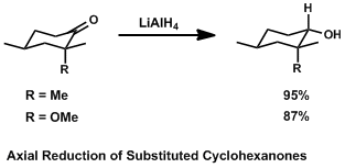 Cieplak's proposal is supported by investigating the effects of various electronic substituents on product distribution. By installing an electron-withdrawing substituent such as a methoxy group at the C2 position, the reduction of substituted cyclohexanones begins to favor equatorial attack.[4] This is because the axial C-O bond is a worse electron donor than a C–C bond, so axial attack is less favored.