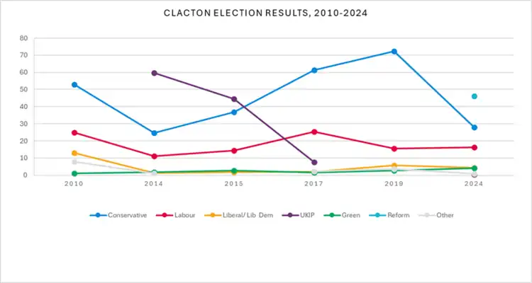 - Clacton UK Parliament constituency (boundaries from June 2024) at MapIt UK