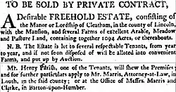 Sale notice for Cleatham Estate in 1800