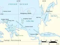 The bay is about 100 kilometres (62 mi) deep (east to west) and 65 kilometres (40 mi) wide (north to south).[1] It is bounded by the Yampi Peninsula to the south,[2] the Montgomery Reef and Koolan Island at its western extent, with Camden Sound Marine Park beyond.[3] The Kingfisher Islands, Traverse Island, Fletcher Island, and a number of other small islands lie within the bay. Fresh water flows into the bay via Secure Bay, as well as the Walcott Inlet, which brings water from the Charnley, Calder and Isdell Rivers into the bay via Yule Entrance.[4][2]
