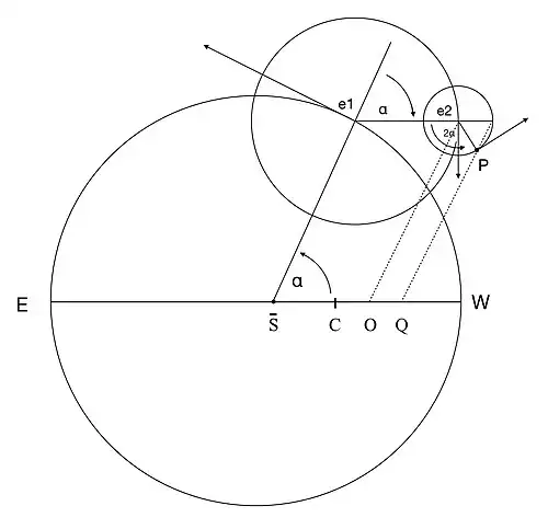 The planet itself, represented by the point P in the diagram, revolves uniformly from west to east around the circumference of the second epicycle, whose radius is exactly one third of that of the first, at twice the rate of revolution of e1 about S. This device enabled Copernicus to dispense with the equant, a much-criticised feature of Claudius Ptolemy's theories for the motions of the outer planets. In a heliocentric version of Ptolemy's models, his equant would lie at the point Q in the diagram, offset along the line of apses EW from the point S by a distance one and a third times the radius of Copernicus's first epicycle. The centre of the planet's deferent, with the same radius as Copernicus's, would lie at the point C, mid-way between S and Q. The planet itself would lie at the point of intersection of this deferent with the line QP. While this point only coincides exactly with P whenever they are both at an apsis,[h] the difference between their positions is always negligible in comparison with the inaccuracies inherent to both theories.