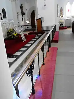 The altar rail (also known as a communion rail or chancel rail) is a low barrier, sometimes ornate and usually made of stone, wood or metal in some combination, delimiting the chancel or the sanctuary and altar in a church,[1][2] from the nave and other parts that contain the congregation. Often, a central gate or gap divides the line into two parts. Chancel rails are a very common, but not universal, feature of Roman Catholic, Lutheran, Anglican, and Methodist churches. They are usually about 2 feet 6 inches (76 cm) high, with a padded step at the bottom, and designed so that the wider top of the rail can support the forearms or elbows of a kneeling person.