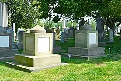Of the 186 contributing objects, 168 are the nearly identical Congressional cenotaphs, believed to have been designed by the Architect of the Capitol Benjamin Latrobe.[21] As used at the Congressional Cemetery, the term "cenotaph" includes not only monuments to those buried elsewhere, but also the Latrobe monuments that mark occupied graves of representatives and senators. Some congressmen are buried under a cenotaph, some are buried without one in a different area of the cemetery, and for some the marker is a true cenotaph. James Gillespie (1747–1805), who was reinterred in 1892, has a separate grave and cenotaph.