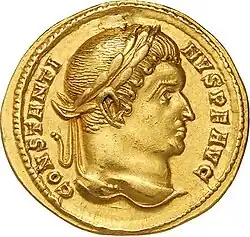 Constantine sent Galerius an official notice of Constantius' death and his own acclamation. Along with the notice, he included a portrait of himself in the robes of an Augustus.[73] The portrait was wreathed in bay.[75] He requested recognition as heir to his father's throne and passed off responsibility for his unlawful ascension on his army, claiming they had "forced it upon him".[76] Galerius was put into a fury by the message; he almost set the portrait and messenger on fire.[77] His advisers calmed him and argued that outright denial of Constantine's claims would mean certain war.[78] Galerius was compelled to compromise: he granted Constantine the title "caesar" rather than "augustus" (the latter office went to Severus instead). Wishing to make it clear that he alone gave Constantine legitimacy, Galerius personally sent Constantine the emperor's traditional purple robes. Constantine accepted the decision, knowing that it would remove doubts as to his legitimacy.[79]