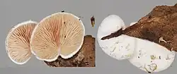 Crepidotus albolanatus, is a species of saprophytic fungus in the family Crepidotaceae with a stipeless sessile finely felted cap. Colour is pure white, cap diameter 10–35 mm and has been found in New Zealand on the debris of the nikau palm (Rhopalostylis sapida).[3][2]