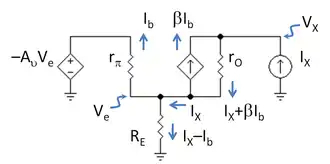 An idealized treatment of output resistance is given in the footnote.[nb 2] A small-signal analysis for an op amp with finite gain Av but otherwise ideal is based upon Figure 5 (β, rO and rπ refer to Q2). To arrive at Figure 5, notice that the positive input of the op amp in Figure 3 is at AC ground, so the voltage input to the op amp is simply the AC emitter voltage Ve applied to its negative input, resulting in a voltage output of −Av Ve. Using Ohm's law across the input resistance rπ determines the small-signal base current Ib as: